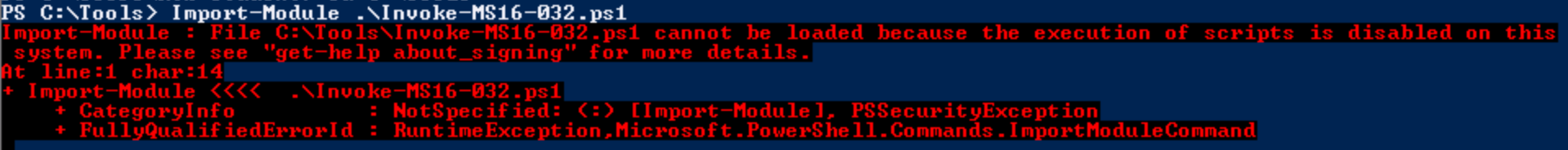 Trying to Import-Module without bypassing the execution policy will result in an error.