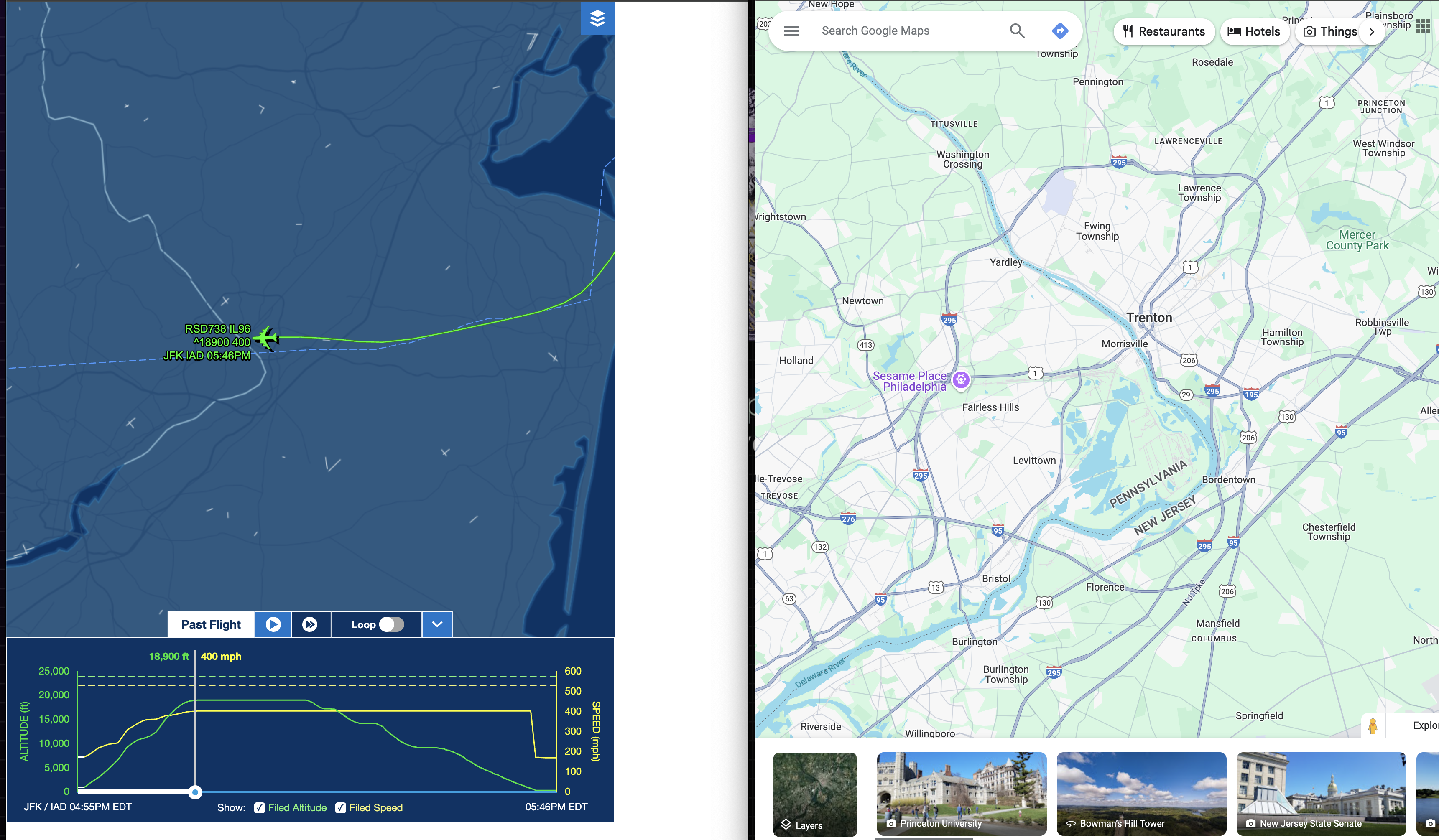 The map of the flight itself does not display city names, therefore I have to use Google Maps to compare the flight path. Luckily, the flight at that time was near a river with a specific shape.