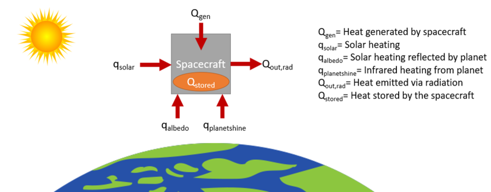 The basic heat sources in a spacecraft are the instruments, heaters or solar absorption while the only heat loss mechanism is radiation.