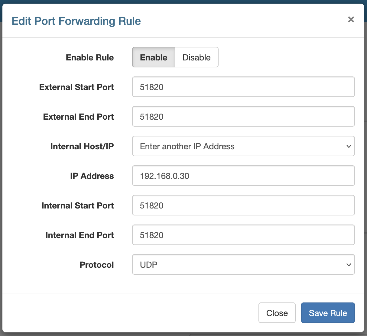 Now we need to forward the VPN port to our Raspberry Pi. This is done in your router settings. The port we need to forward is 51820. The process is different for every router, so you’ll have to look up how to do it for your specific router.