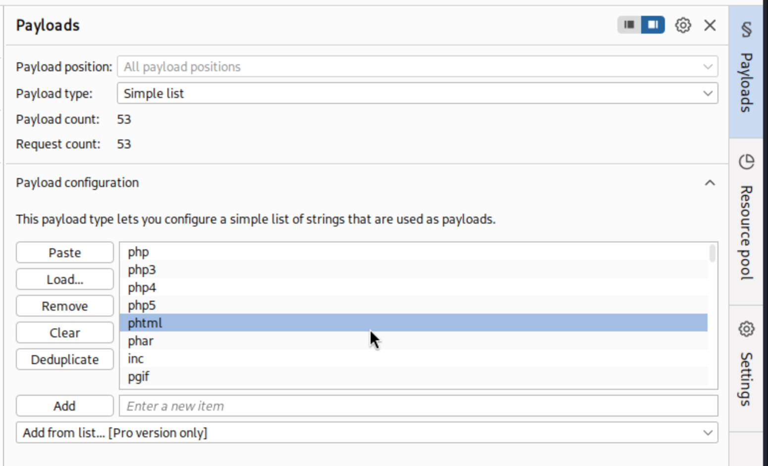 -fr "Location: /failed.php"-wis the wordlist to use. In this case, I used the web extensions list from SecLists.-uis the URL to fuzz. In this case, it is the upload.php page.-Xis the HTTP method to use. In this case, it is POST.-His the HTTP header to use. In this case, I used the Content-Type and Cookie headers.-dis the data to send. In this case, it is the multipart/form-data request with the file name set to FUZZ.-fris the filter to use. In this case, it is the Location header that indicates a failed upload.