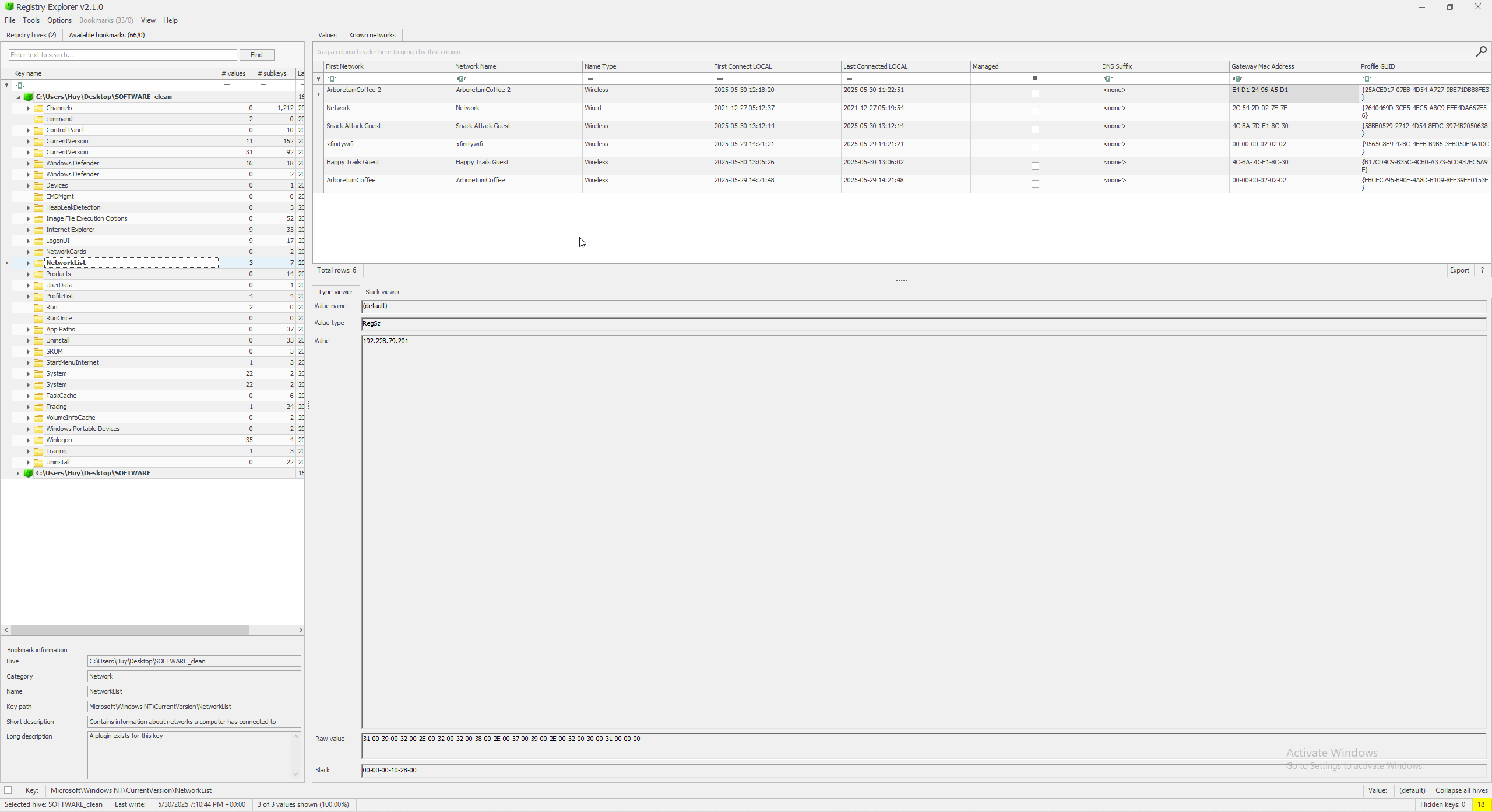I tried to find the BSSID (MAC Address) of the access point from the Event Logs but could not. After a while of digging, I found it from the SOFTWARE registry under NetworkList