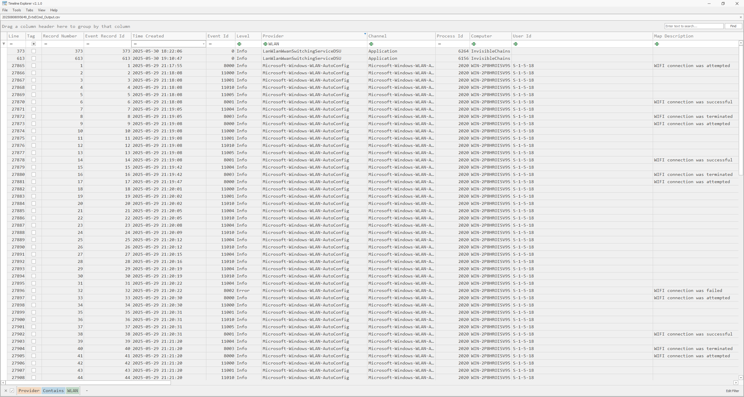 .\EvtxECmd.exe -d ~\Desktop\logs\ --csv ~\Desktop\I found several pieces of information regarding the network connection: