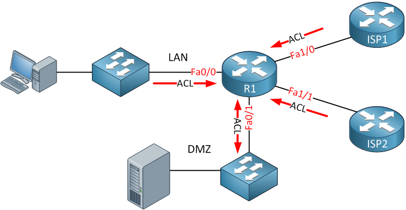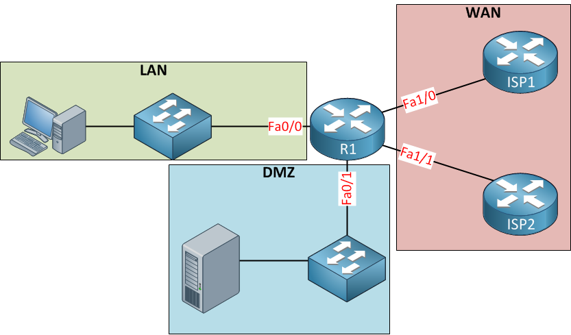Above, you see a small network that has an LAN, DMZ, and WAN with two ISPs. Let’s say our security policy looks like this: