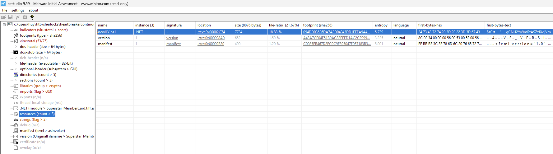 Also, the fifth question asks us to specify the hexadecimal offset where the obfuscated code of the identified original file begins in the binary. The location column in the resources section shows the offset of the resource in the binary.