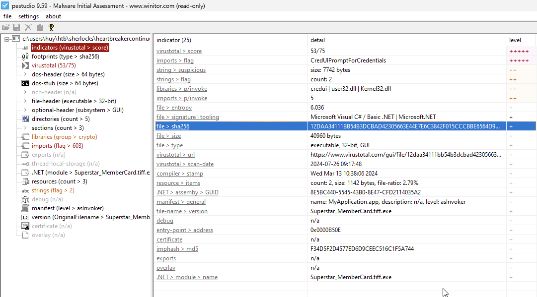 Therefore, it acts as a unique identifier for the file. We can get it by using the sha256sum command or by PEStudio.