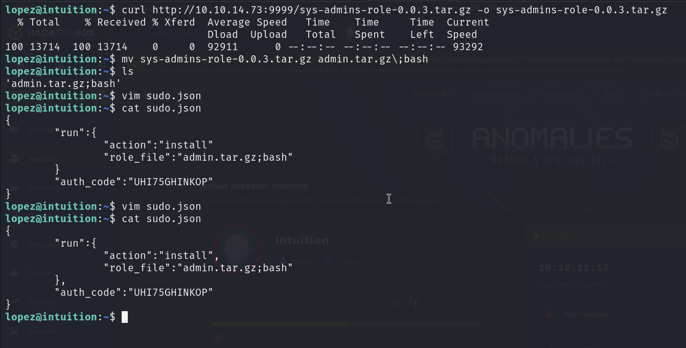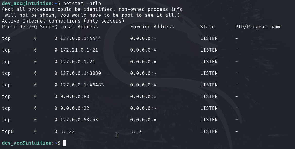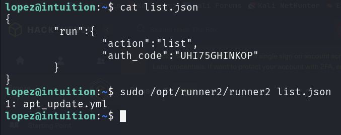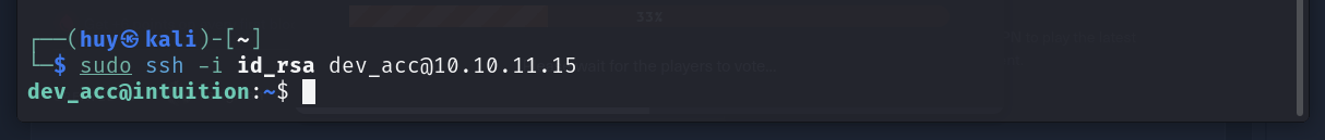 ssh lopez@10.10.11.15lopez@intuition:~$ lopez@intuition:~$ sudo -1