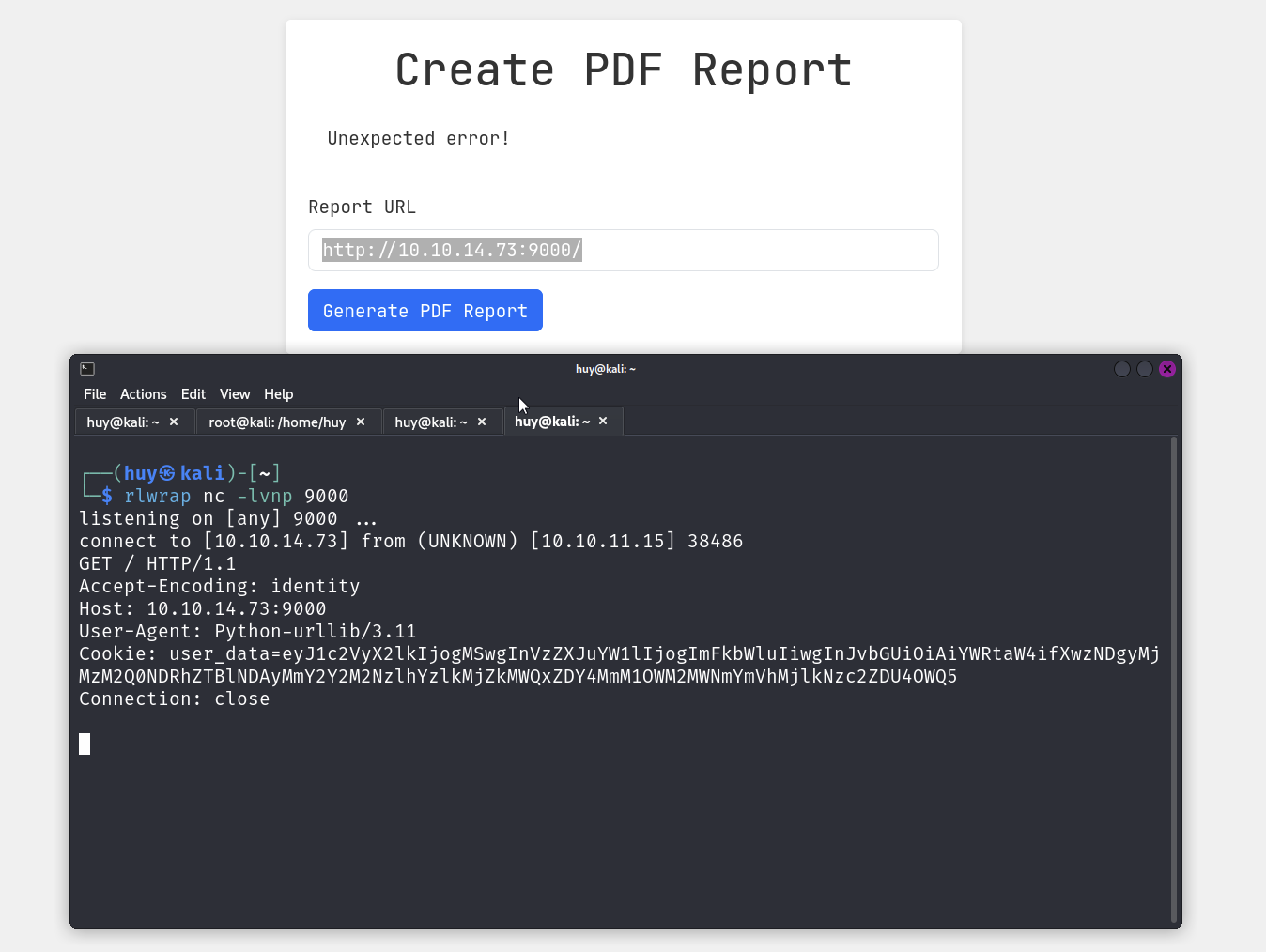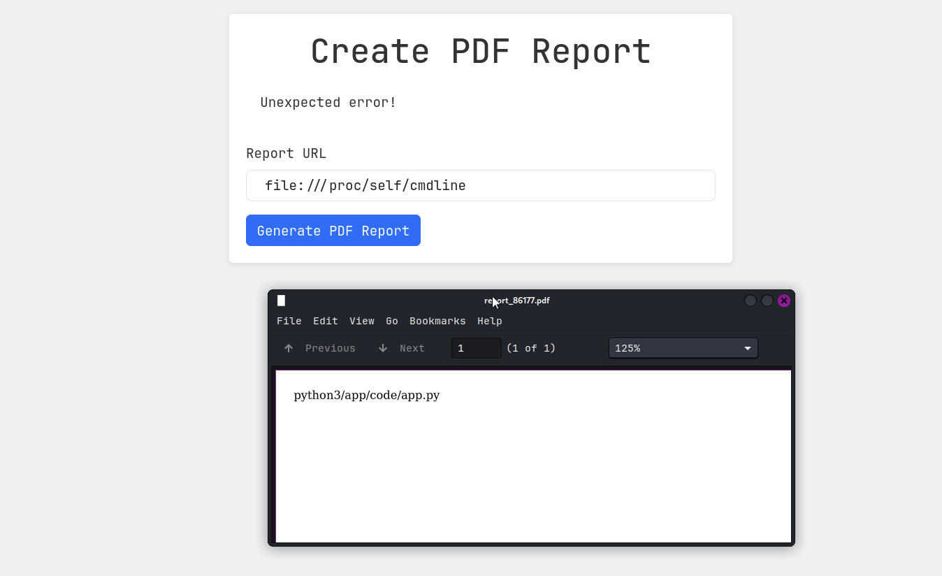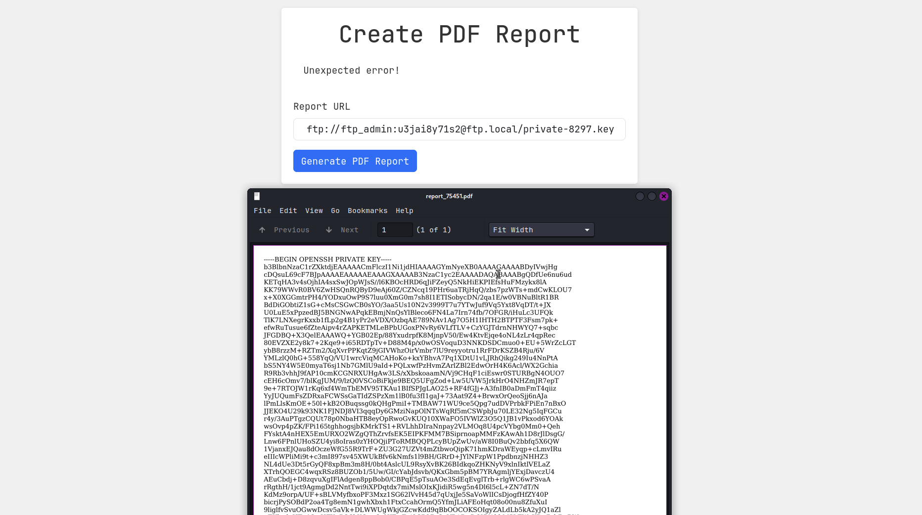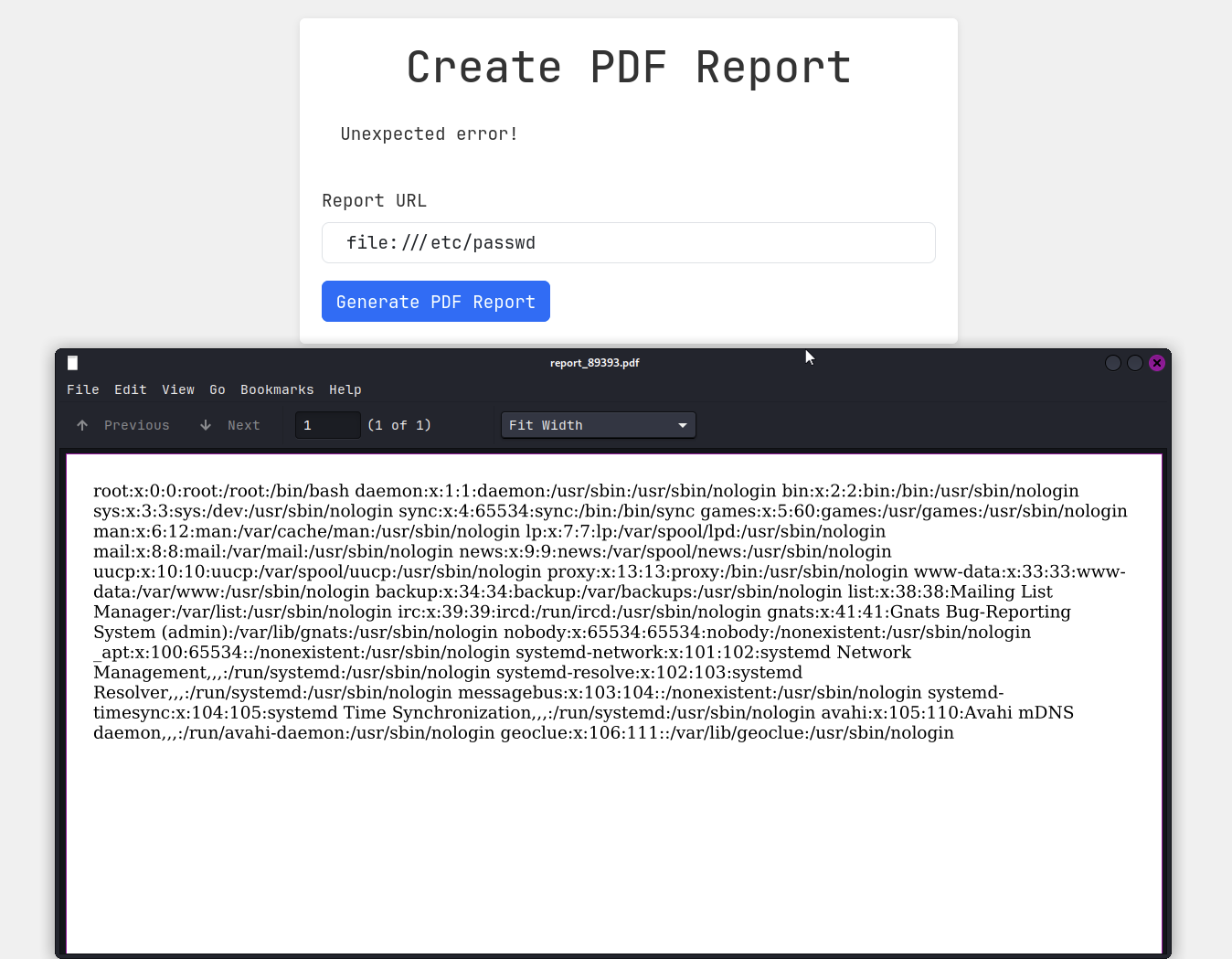 I did some enumeration and found that the wkhtmltopdf is installed on the machine. I tried to create a PDF report with the following payload. However, seems like we cannot proceed further with this method.