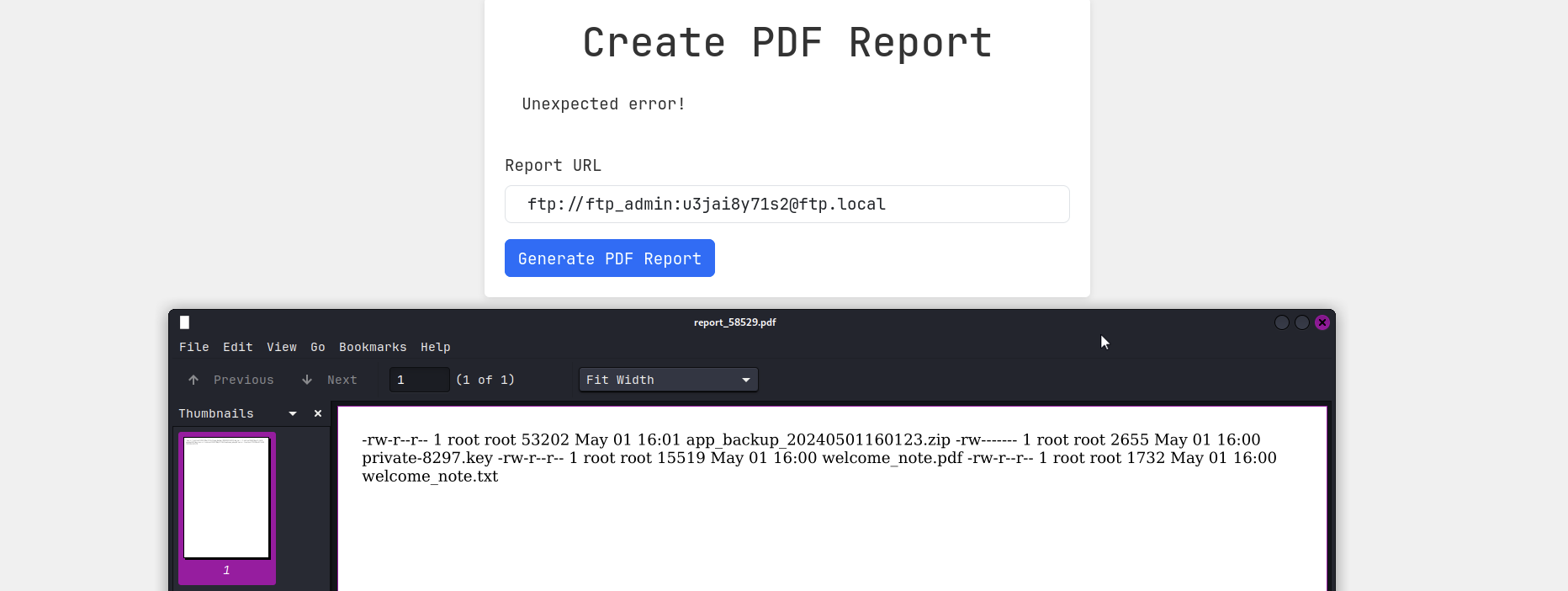 From the auth.py file, I can find the ftp credentials. with that being said, we can ftp access to the machine through the create report function.