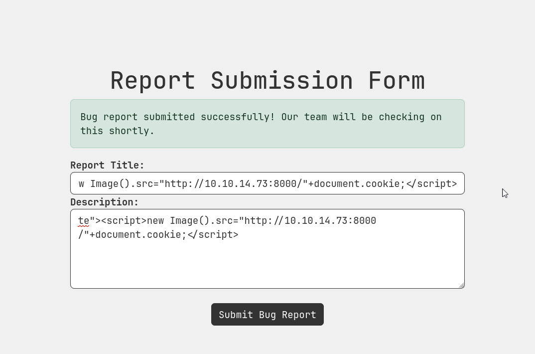 The login page requires username and password. I registered one and explore around, I can see that the user can report bug through a form. And the form is vulnerable to XSS.
